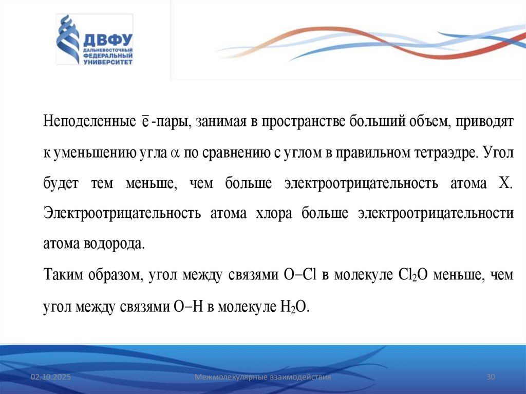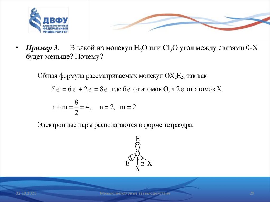 • Пример 3. В какой из молекул H2O или Cl2O угол между связями 0-Хбудет меньше? Почему?