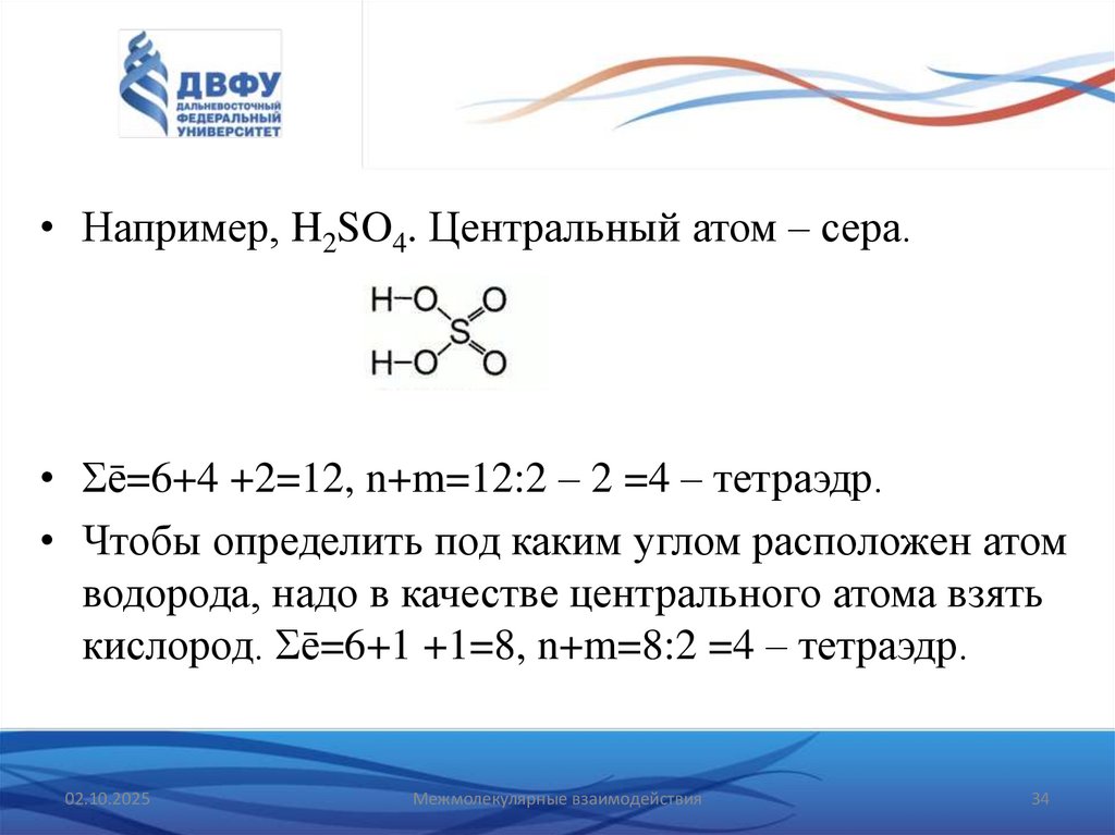 • Например, H2SO4. Центральный атом – сера.• Σē=6+4 +2=12, n+m=12:2 – 2 =4 – тетраэдр.