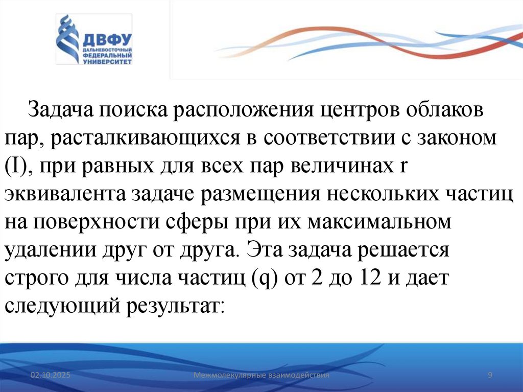 Задача поиска расположения центров облаковпар, расталкивающихся в соответствии с законом