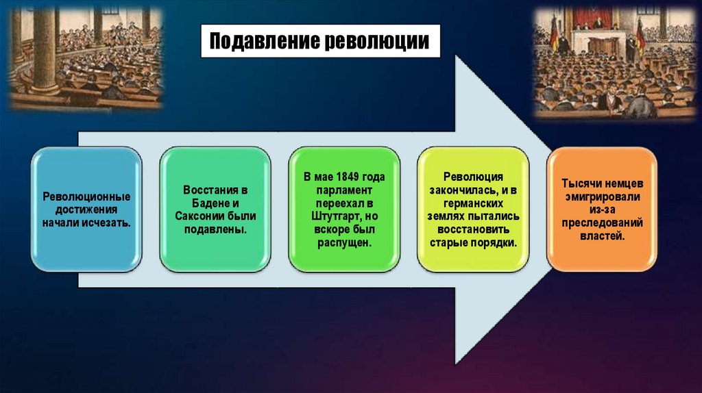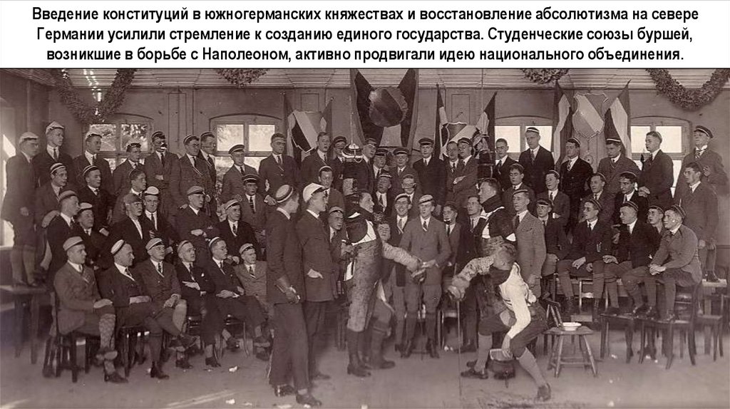 Введение конституций в южногерманских княжествах и восстановление абсолютизма на севереГермании усилили стремление к созданию единого государства. Студенческие союзы буршей,