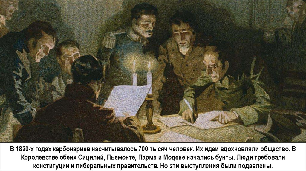 В 1820-х годах карбонариев насчитывалось 700 тысяч человек. Их идеи вдохновляли общество. ВКоролевстве обеих Сицилий, Пьемонте, Парме и Модене начались бунты. Люди требовали