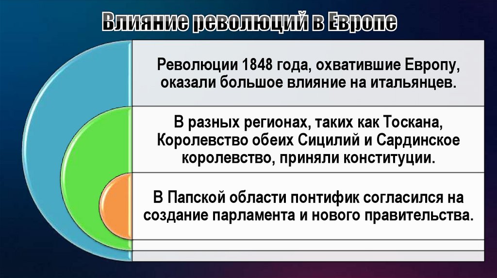 Революции 1848 года, охватившие Европу,оказали большое влияние на итальянцев.