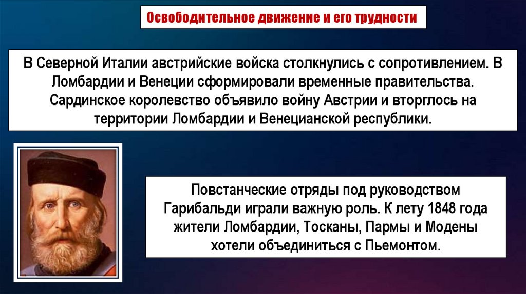 Освободительное движение и его трудностиВ Северной Италии австрийские войска столкнулись с сопротивлением. В