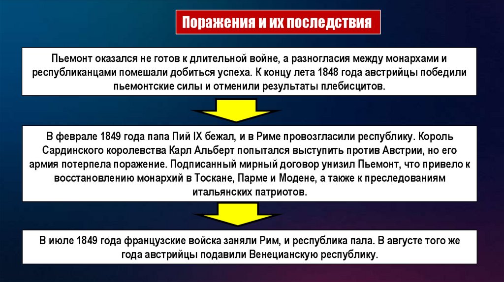 Поражения и их последствияПьемонт оказался не готов к длительной войне, а разногласия между монархами и