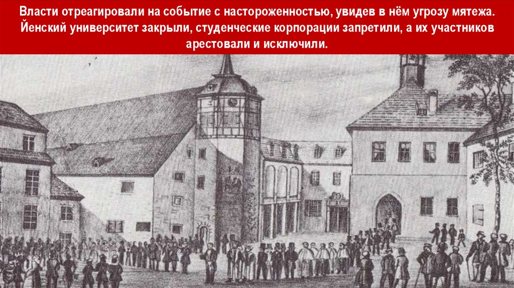 Власти отреагировали на событие с настороженностью, увидев в нём угрозу мятежа.Йенский университет закрыли, студенческие корпорации запретили, а их участников