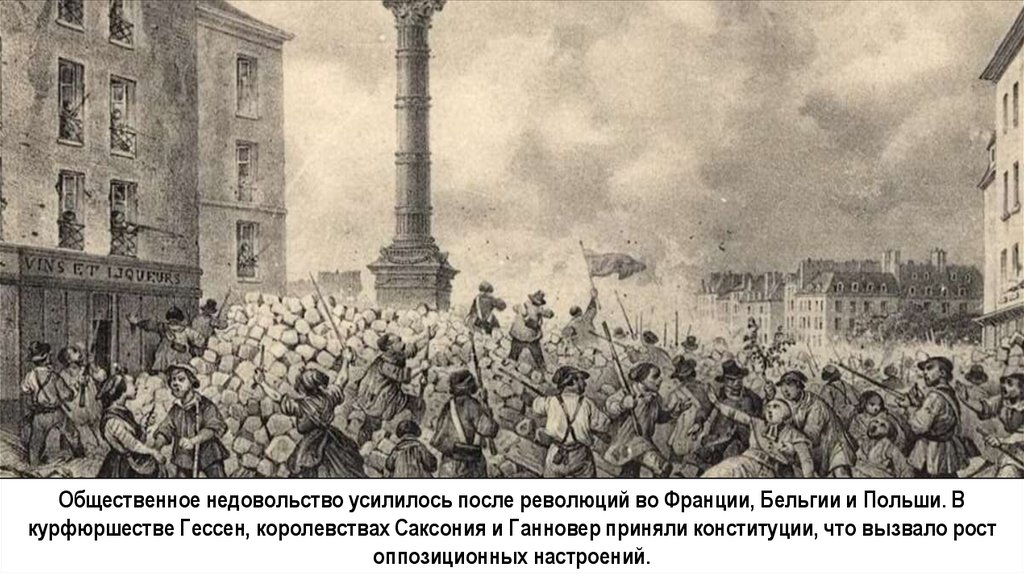 Общественное недовольство усилилось после революций во Франции, Бельгии и Польши. Вкурфюршестве Гессен, королевствах Саксония и Ганновер приняли конституции, что вызвало рост