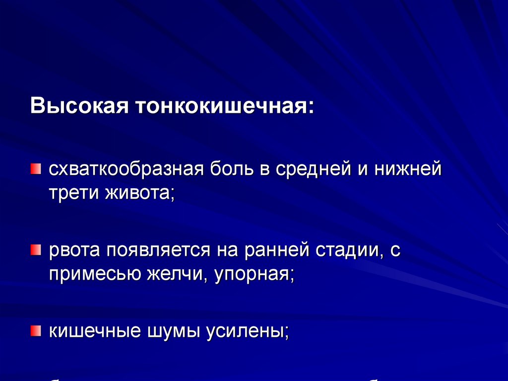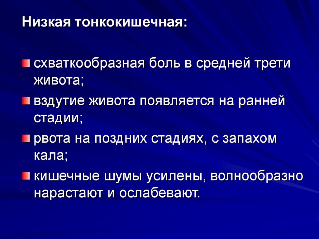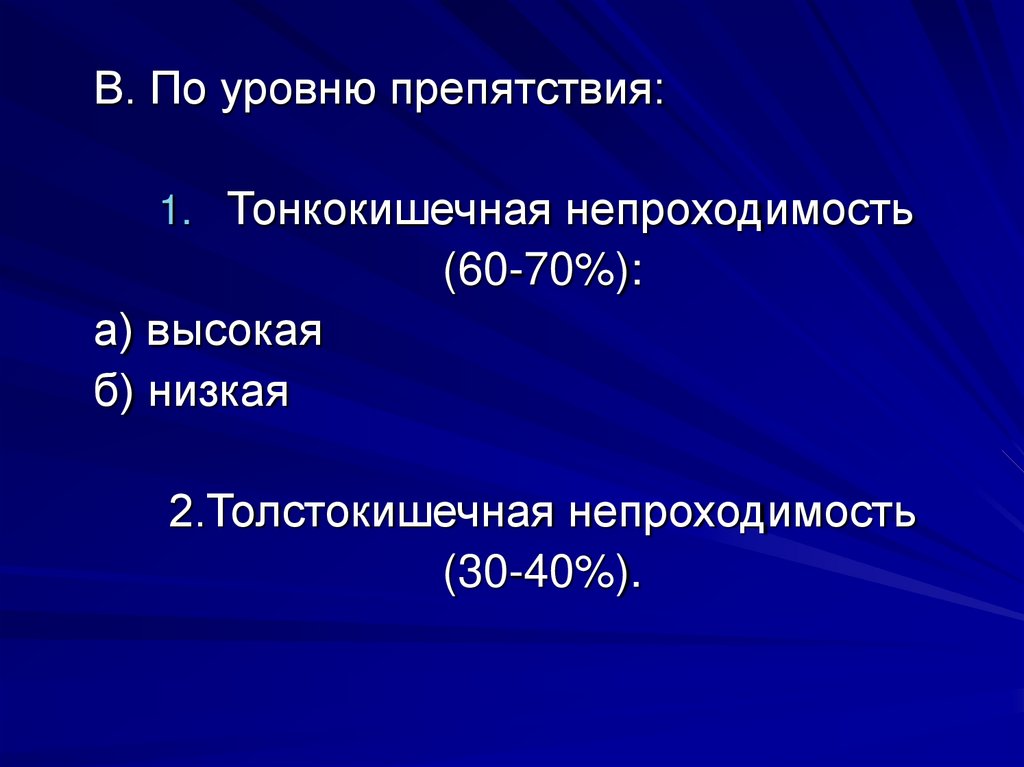В. По уровню препятствия:1. Тонкокишечная непроходимость
