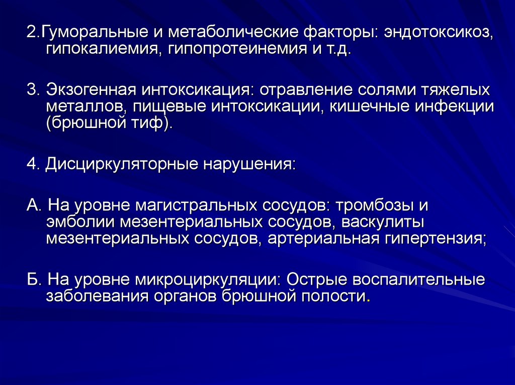 2.Гуморальные и метаболические факторы: эндотоксикоз,гипокалиемия, гипопротеинемия и т.д.