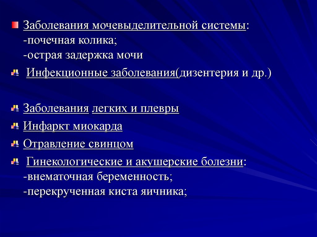 острый панкреатит, брюшнополостные травмы и операции и др.)