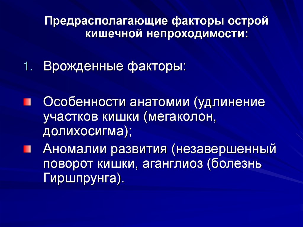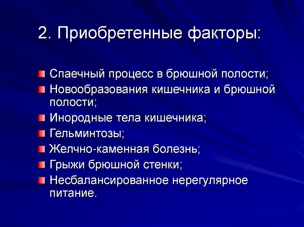 2. Приобретенные факторы:Спаечный процесс в брюшной полости;