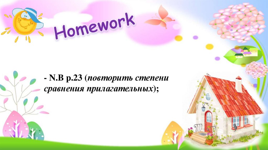 - N.B p.23 (повторить степенисравнения прилагательных);