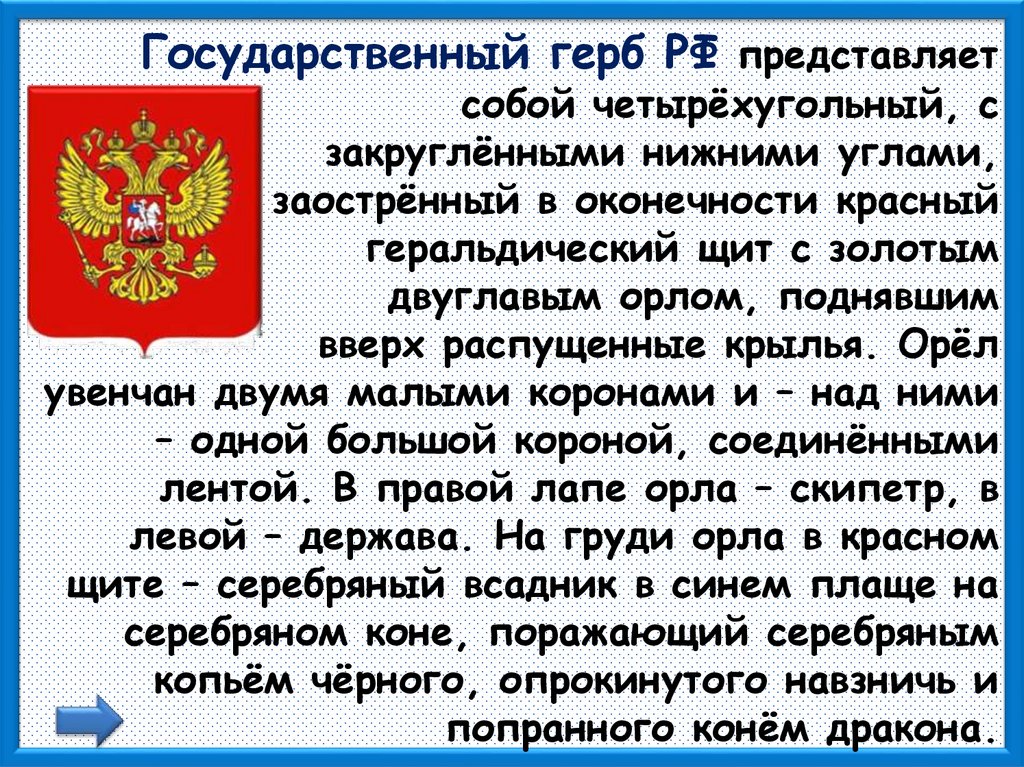 Государственный герб РФ представляетсобой четырёхугольный, с