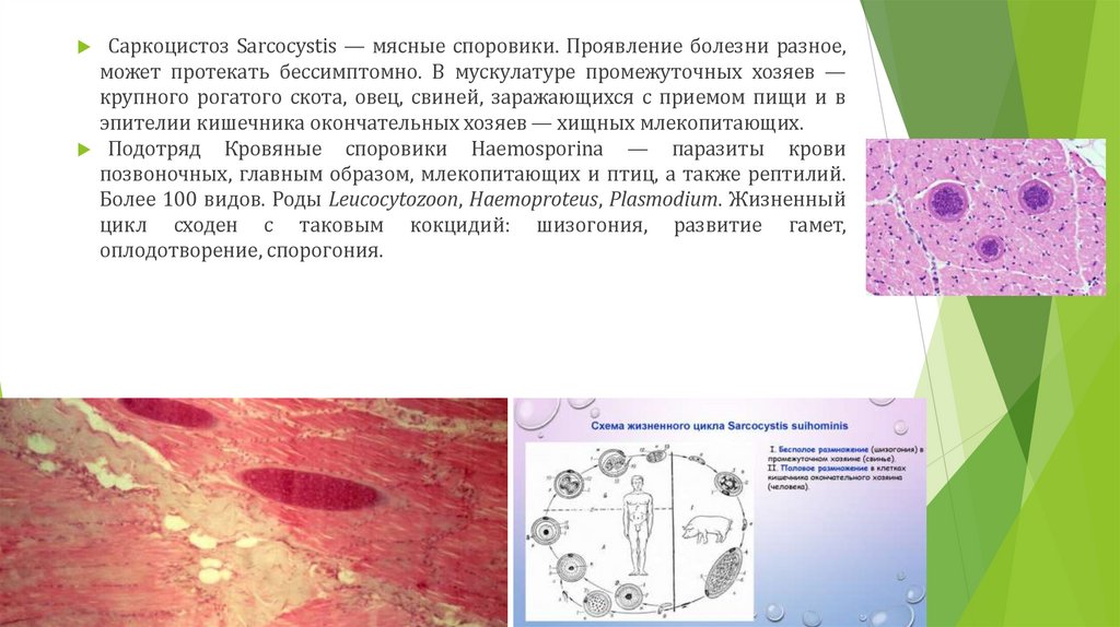 Саркоцистоз Sarcocystis — мясные споровики. Проявление болезни разное,может протекать бессимптомно. В мускулатуре промежуточных хозяев —