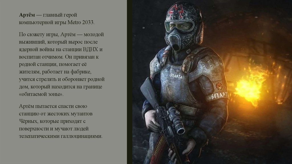 Артём — главный геройкомпьютерной игры Metro 2033.