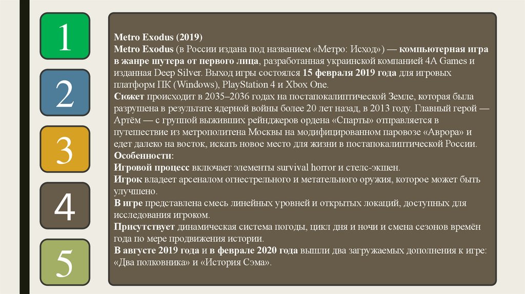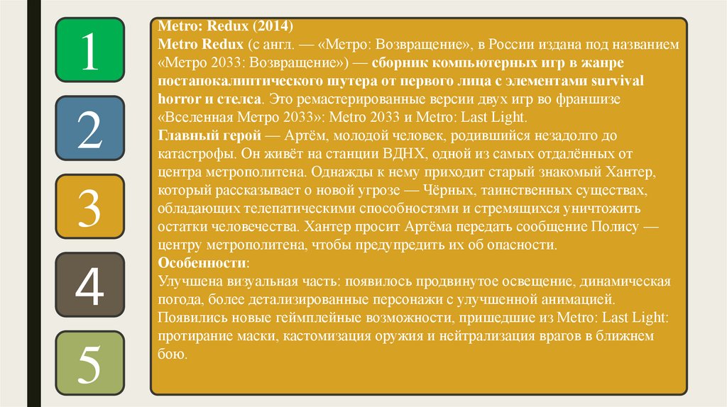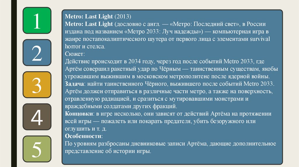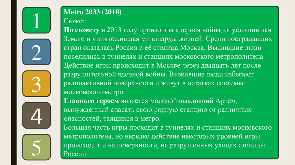 В серии игр Metro 2033 пять частей по порядкувыхода: