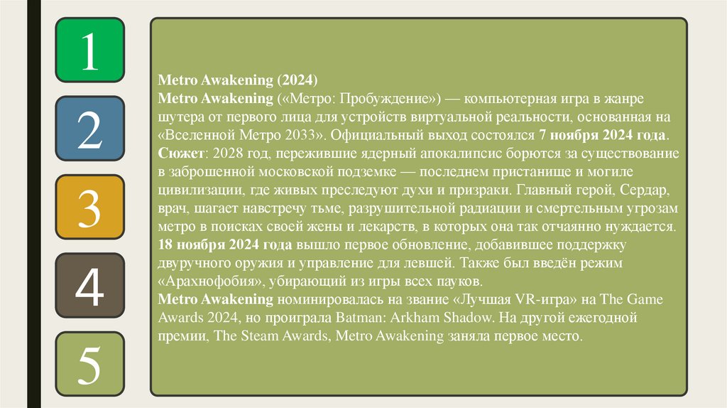 Metro Awakening («Метро: Пробуждение») — компьютерная игра в жанре