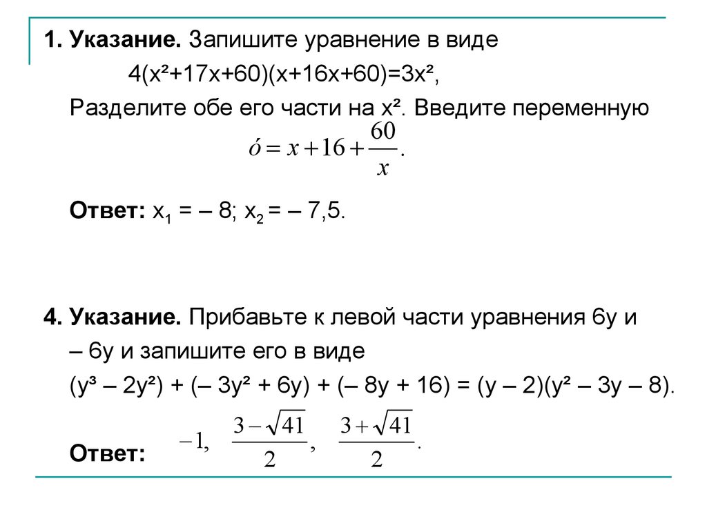 1. Указание. Запишите уравнение в виде4(x²+17x+60)(x+16x+60)=3x²,