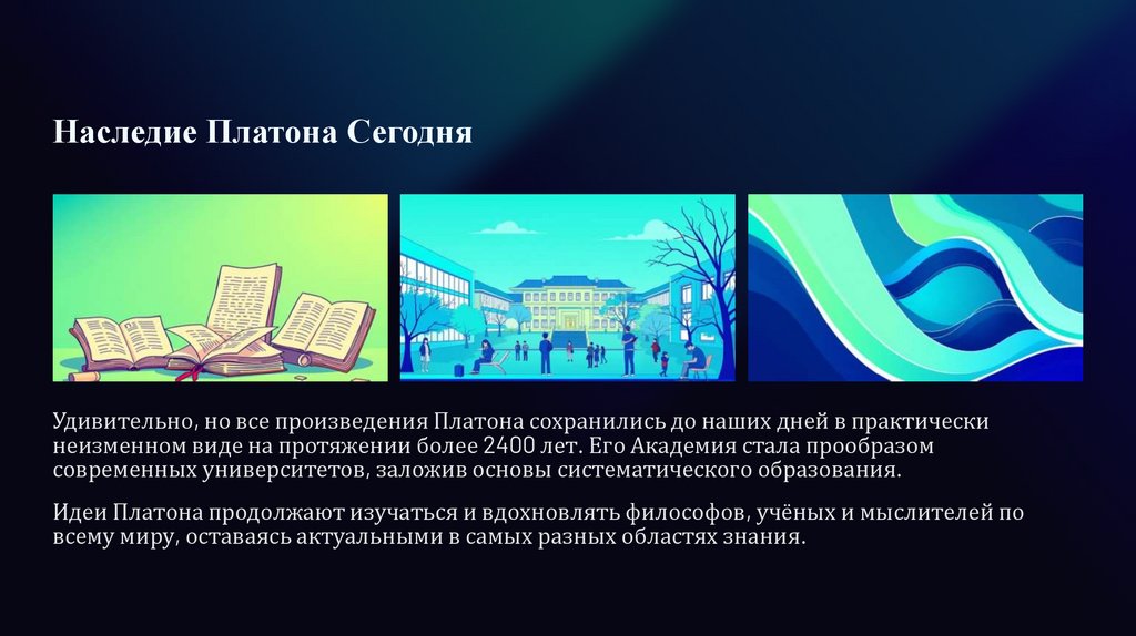 Идеи Платона продолжают изучаться и вдохновлять философов, учёных и мыслителей по