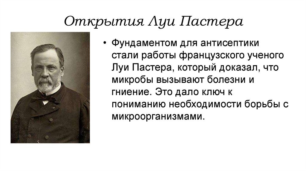 Открытия Луи Пастера• Фундаментом для антисептики