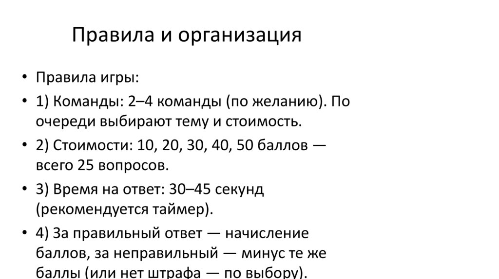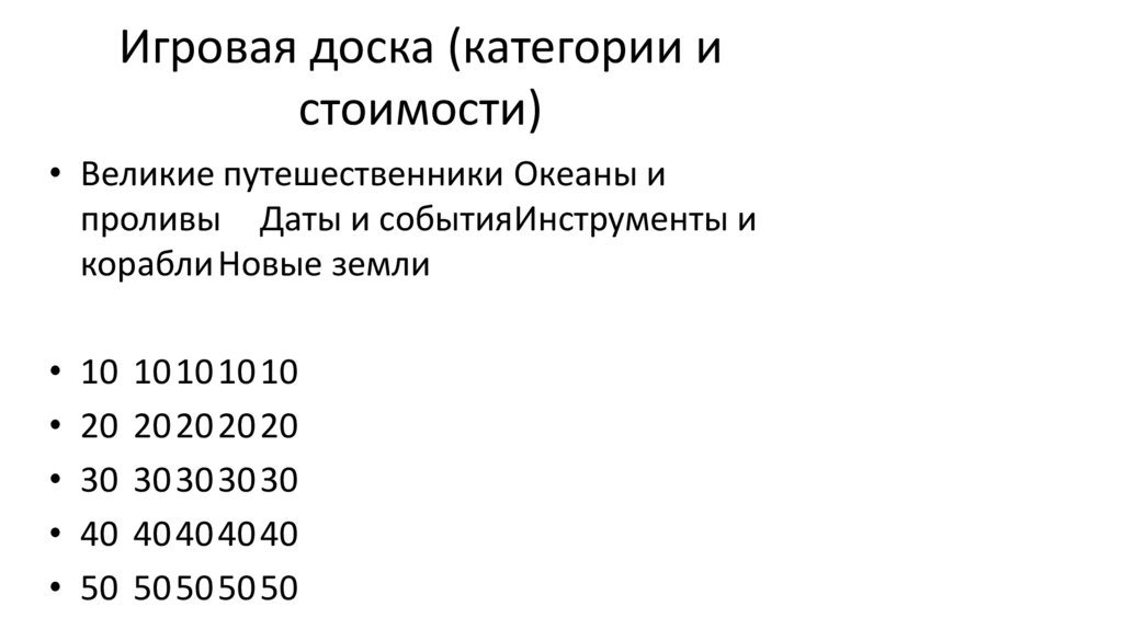 • 2) Стоимости: 10, 20, 30, 40, 50 баллов —