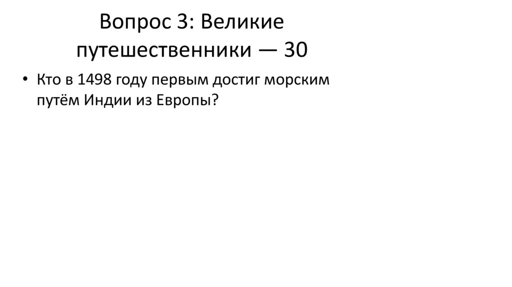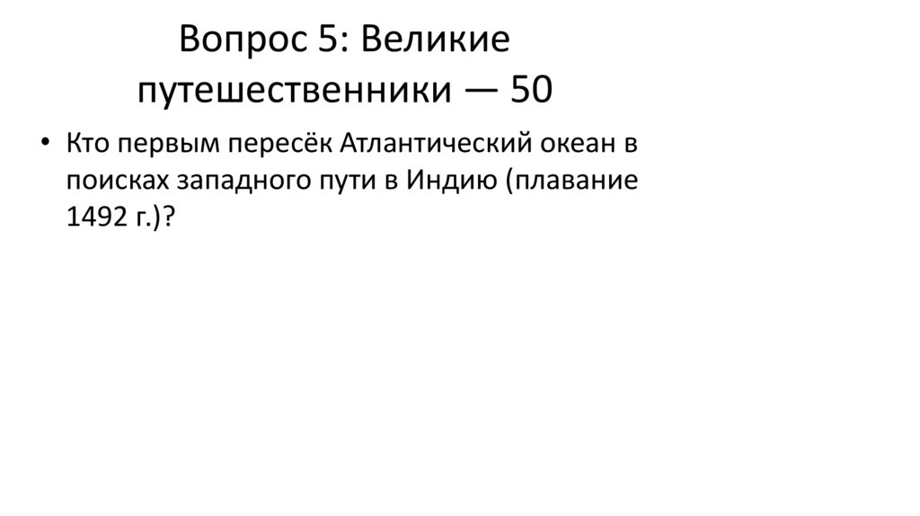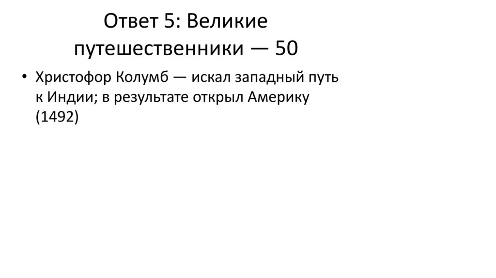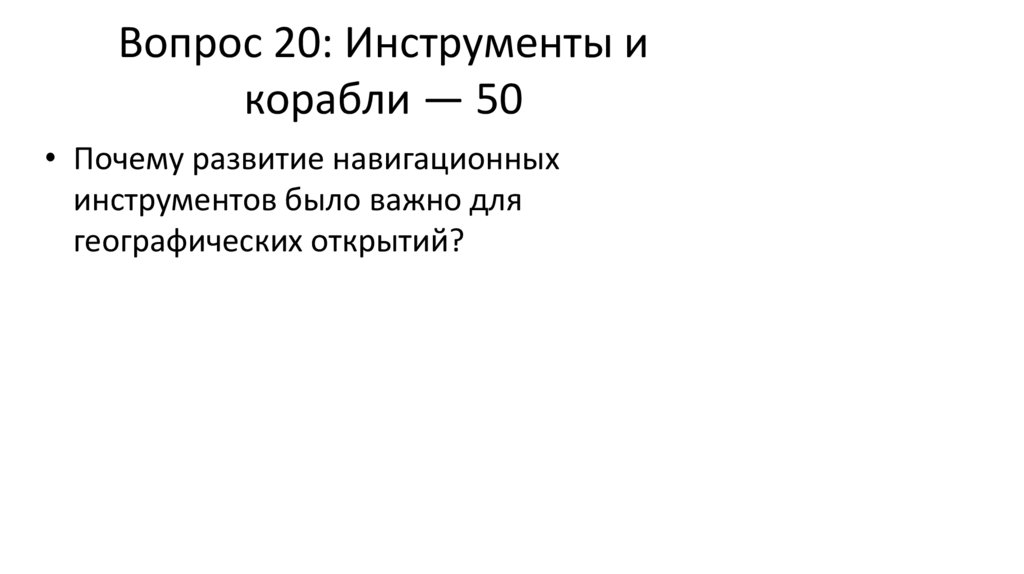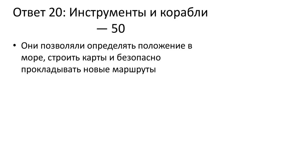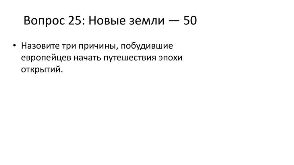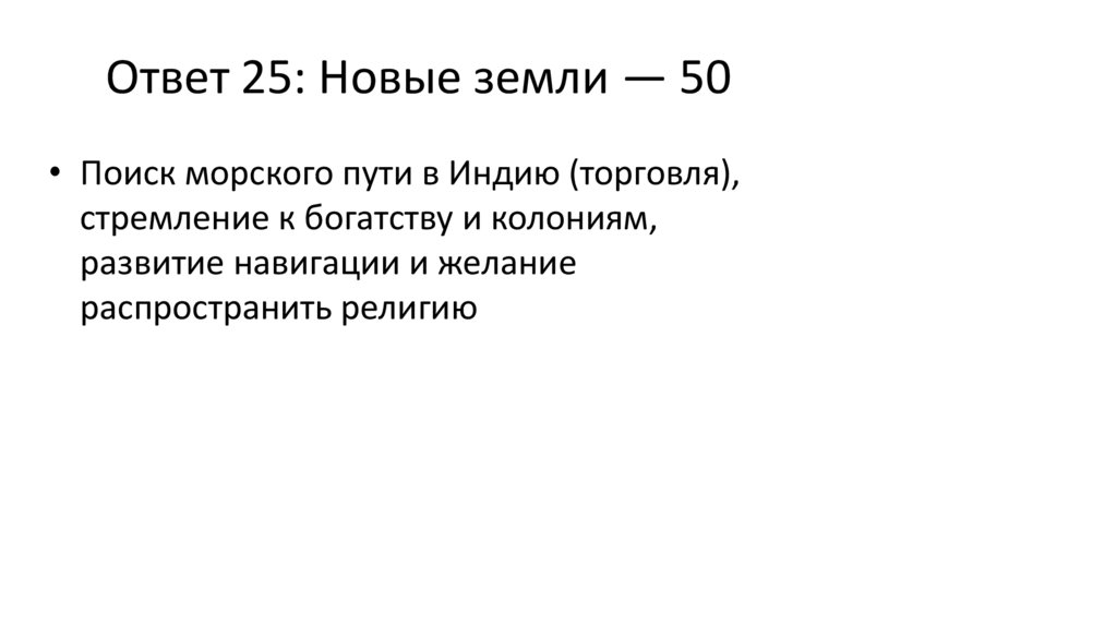 Ответ 25: Новые земли — 50• Поиск морского пути в Индию (торговля),