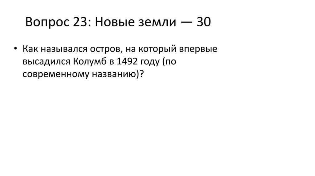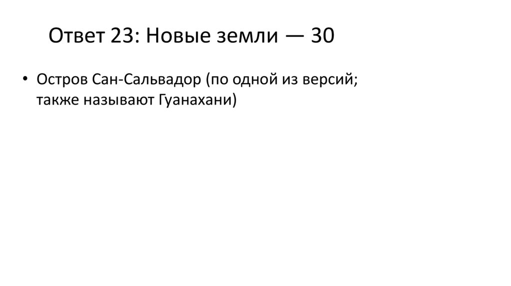 Ответ 23: Новые земли — 30• Остров Сан-Сальвадор (по одной из версий;