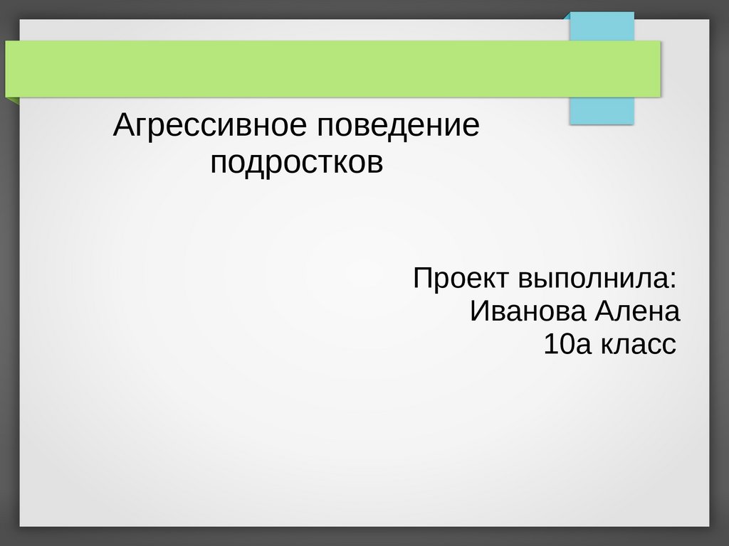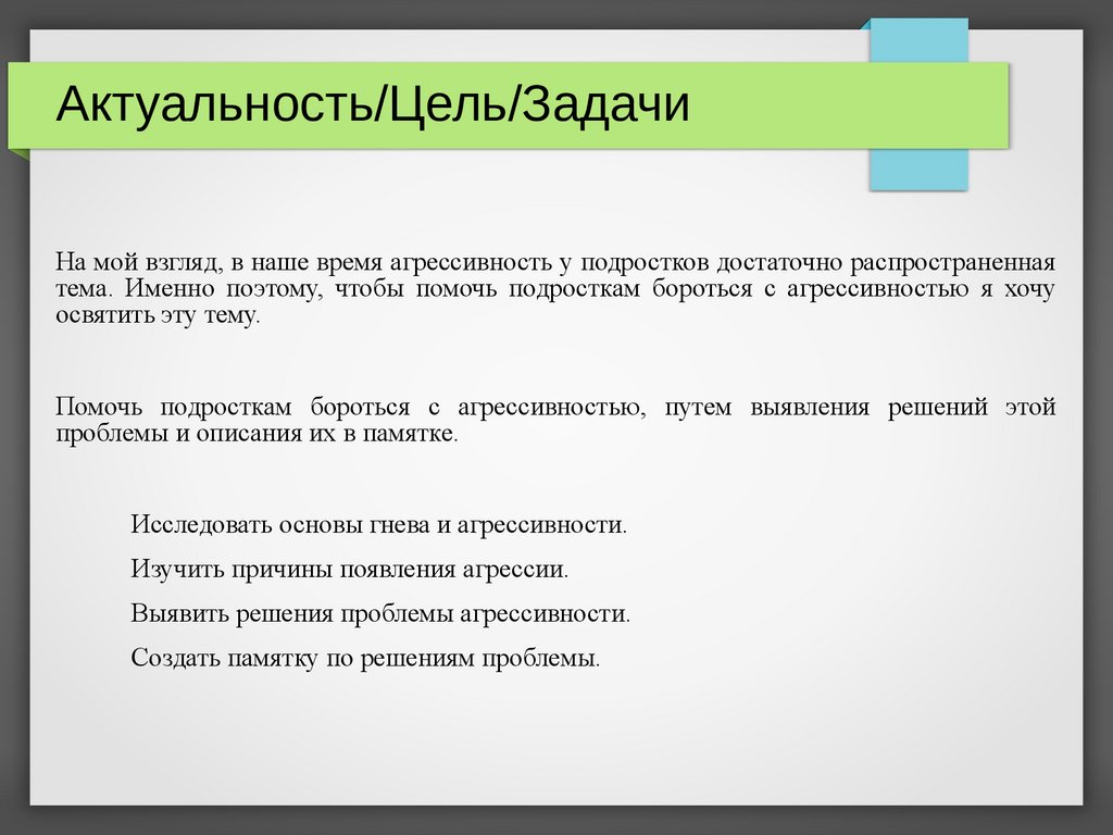 Актуальность/Цель/ЗадачиНа мой взгляд, в наше время агрессивность у подростков достаточно распространенная