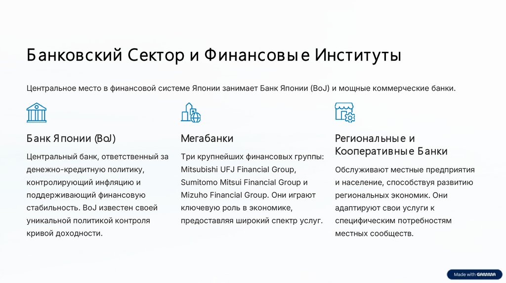 Б анковский Сектор и Ф инансов ы е Инстит утыЦентральное место в финансовой системе Японии занимает Банк Японии (BoJ) и мощные коммерческие банки.