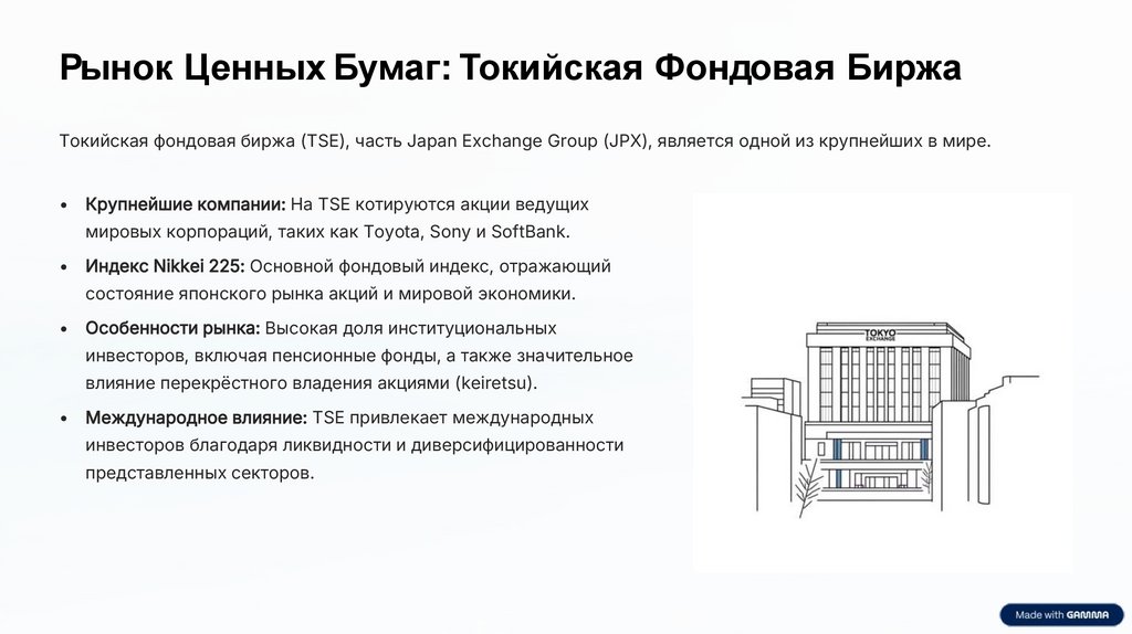 Рынок Ценных Бумаг: Токийская Фондовая БиржаТокийская фондовая биржа (TSE), часть Japan Exchange Group (JPX), является одной из крупнейших в мире.