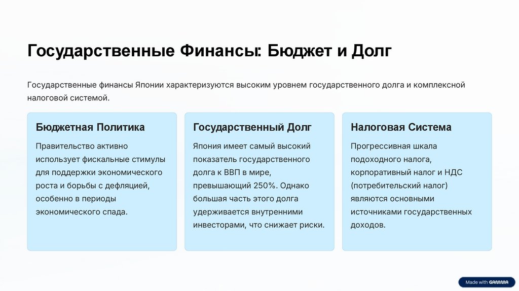 Государственные Финансы: Бюджет и ДолгГосударственные финансы Японии характеризуются высоким уровнем государственного долга и комплексной