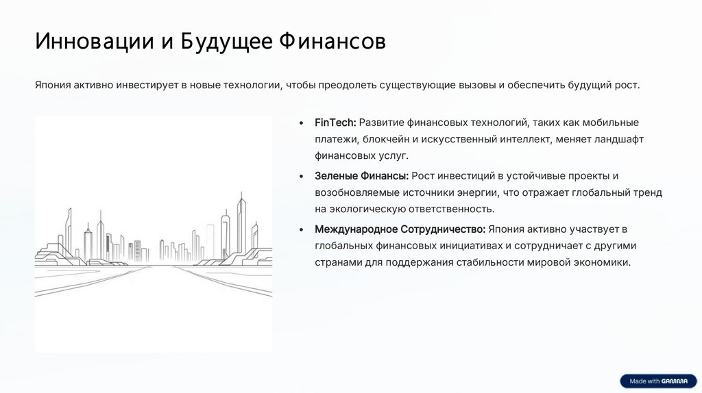 Инновации и Б удущее Ф инансовЯпония активно инвестирует в новые технологии, чтобы преодолеть существующие вызовы и обеспечить будущий рост.