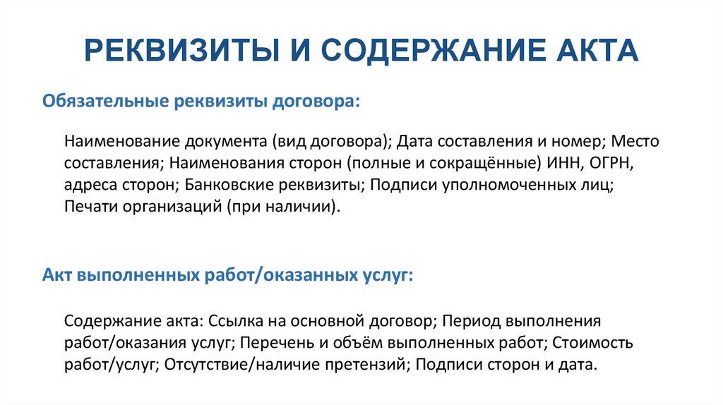 РЕКВИЗИТЫ И СОДЕРЖАНИЕ АКТАОбязательные реквизиты договора: