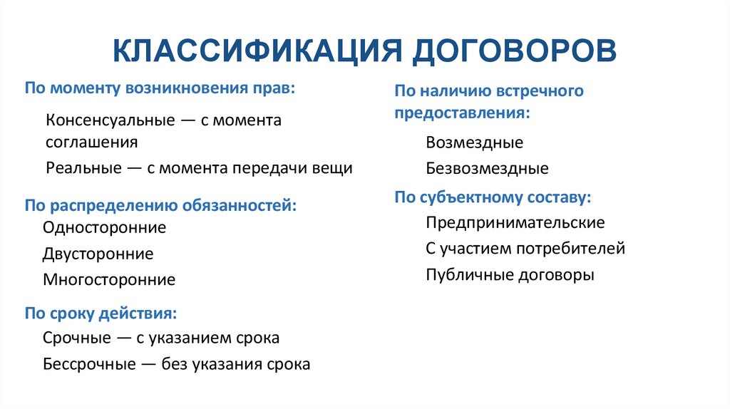 КЛАССИФИКАЦИЯ ДОГОВОРОВПо моменту возникновения прав:
