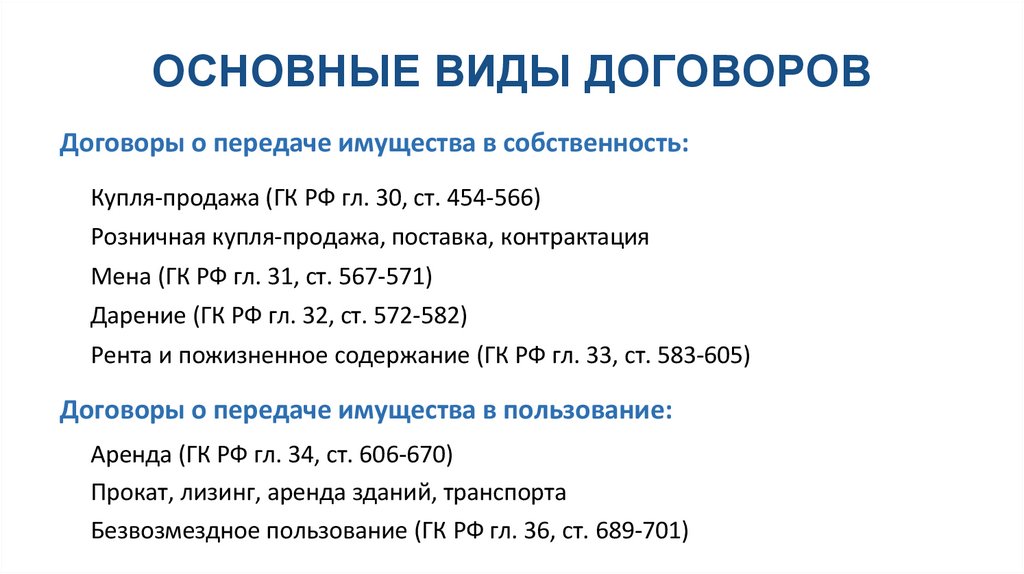 ОСНОВНЫЕ ВИДЫ ДОГОВОРОВДоговоры о передаче имущества в собственность: