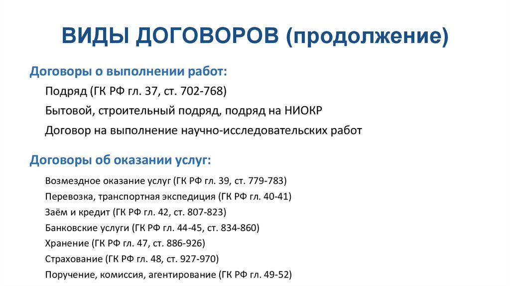 ВИДЫ ДОГОВОРОВ (продолжение)Договоры о выполнении работ: