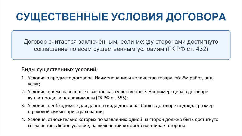 СУЩЕСТВЕННЫЕ УСЛОВИЯ ДОГОВОРАДоговор считается заключённым, если между сторонами достигнуто