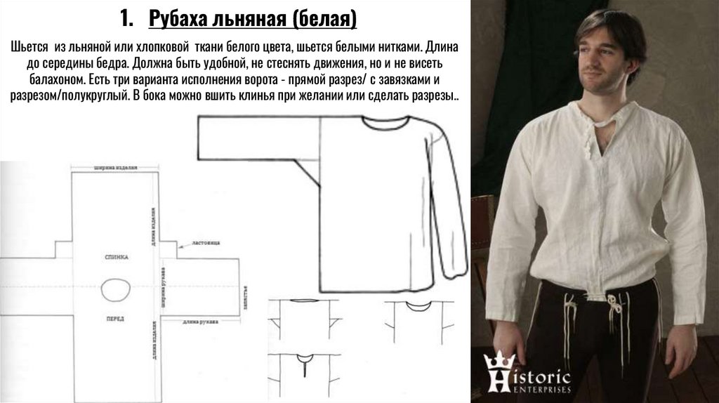 1. Рубаха льняная (белая)Шьется из льняной или хлопковой ткани белого цвета, шьется белыми нитками. Длина