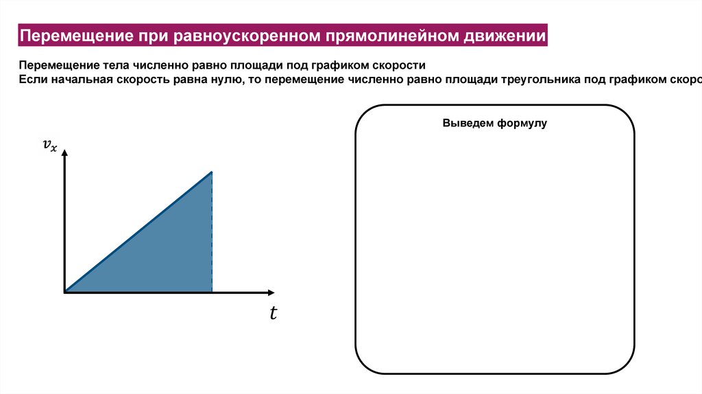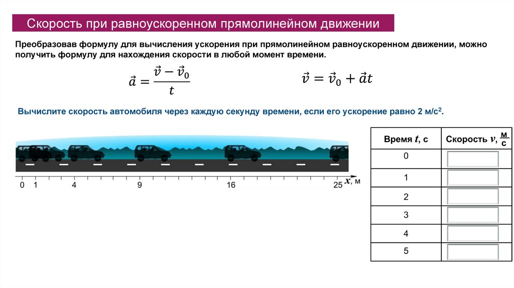Скорость при равноускоренном прямолинейном движенииПреобразовав формулу для вычисления ускорения при прямолинейном равноускоренном движении, можно