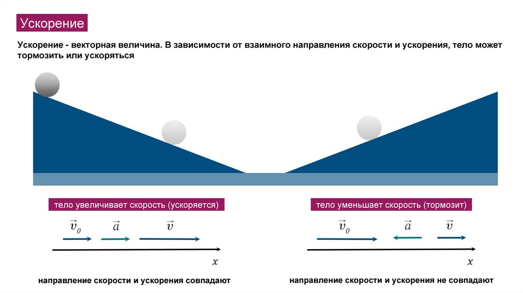 УскорениеУскорение - векторная величина. В зависимости от взаимного направления скорости и ускорения, тело может