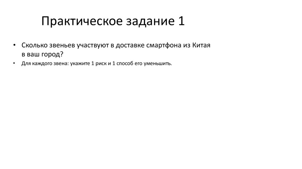 Практическое задание 1• Сколько звеньев участвуют в доставке смартфона из Китая