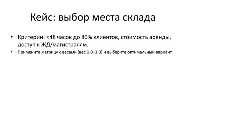 Кейс: выбор места склада• Критерии: <48 часов до 80% клиентов, стоимость аренды,