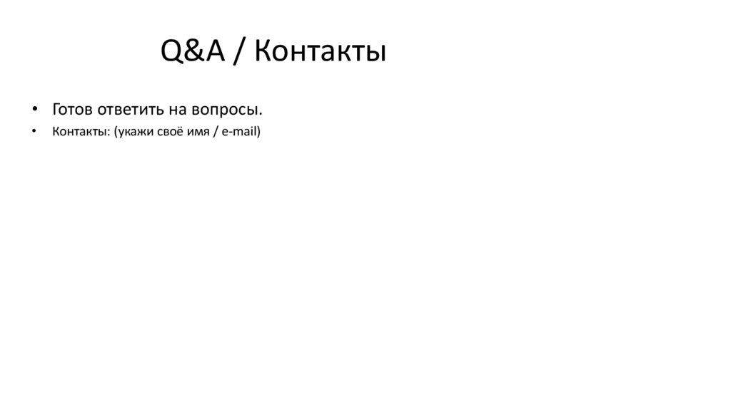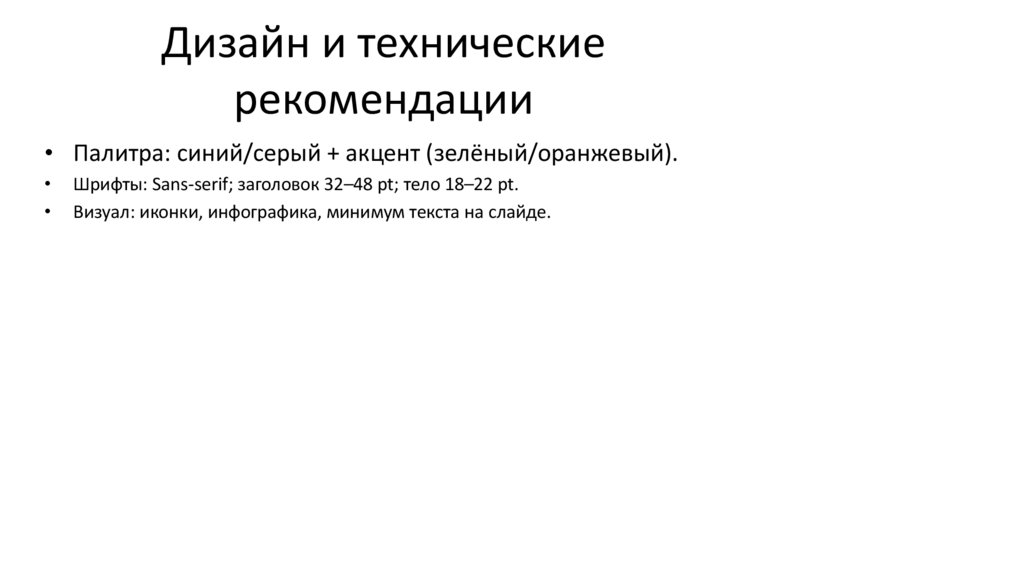 Шрифты: Sans-serif; заголовок 32–48 pt; тело 18–22 pt.