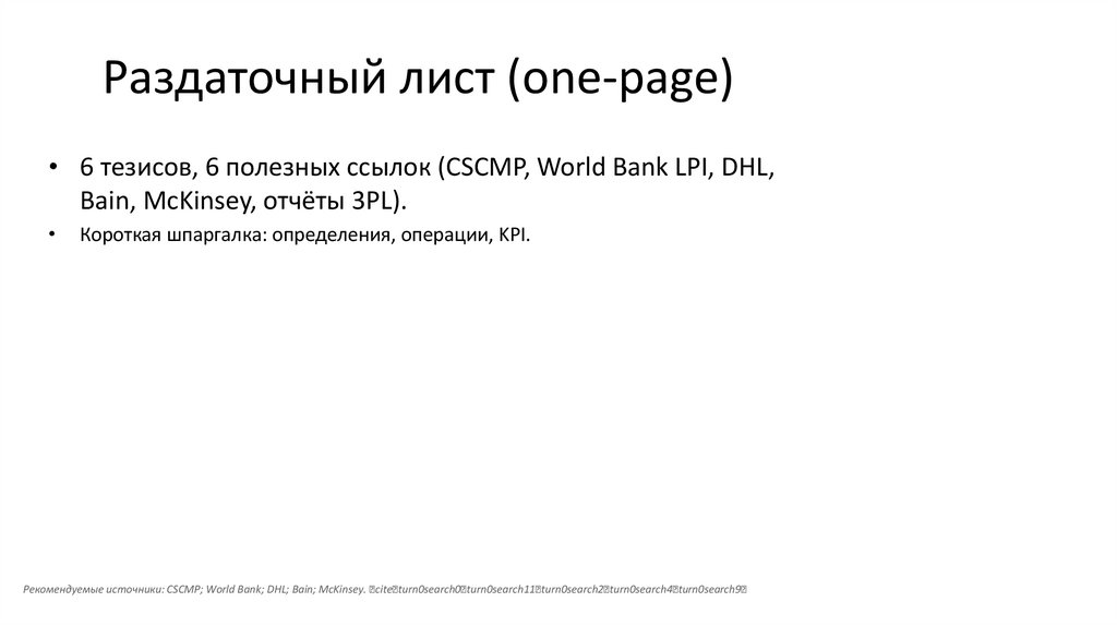 Раздаточный лист (one-page)• 6 тезисов, 6 полезных ссылок (CSCMP, World Bank LPI, DHL,