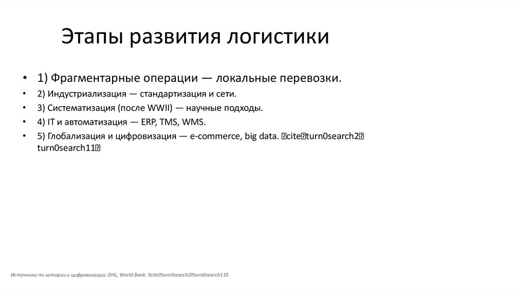 Этапы развития логистики• 1) Фрагментарные операции — локальные перевозки.