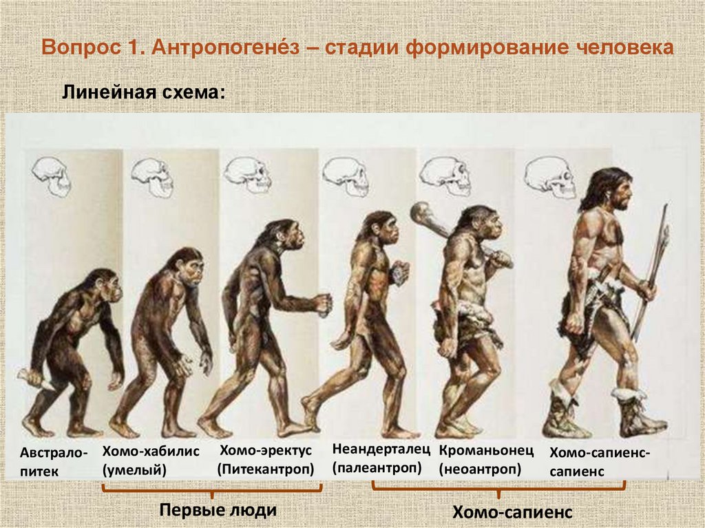 Вопрос 1. Антропогене́з – стадии формирование человекаЛинейная схема:
