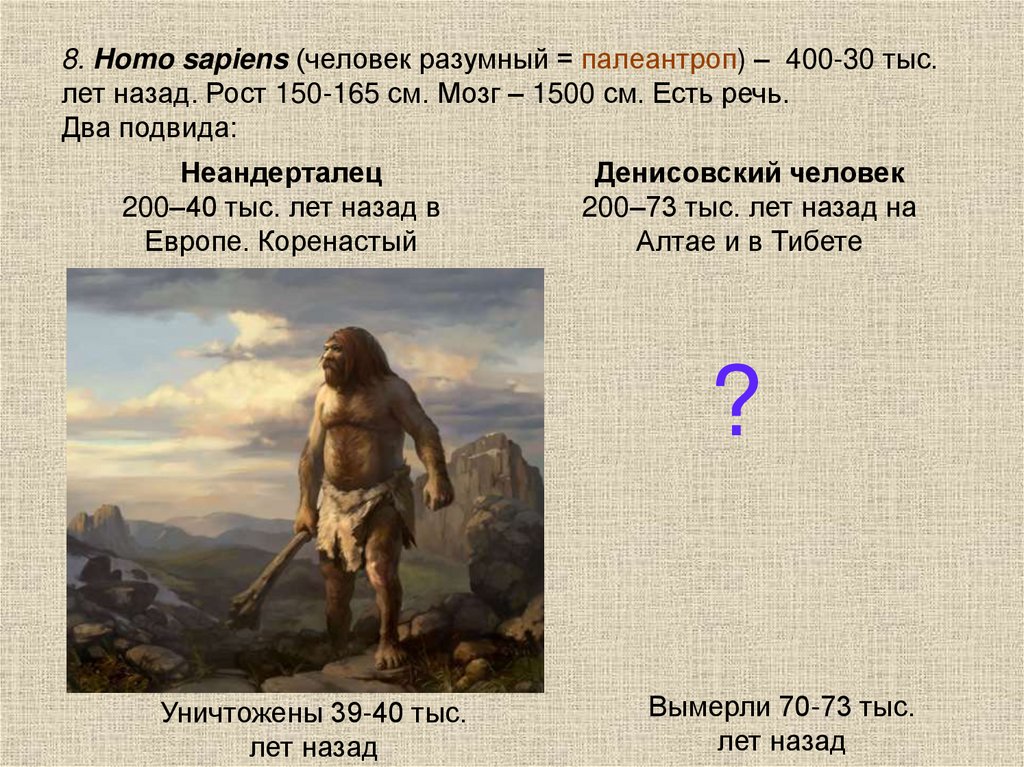 8. Homo sapiens (человек разумный = палеантроп) – 400-30 тыс.лет назад. Рост 150-165 см. Мозг – 1500 см. Есть речь.