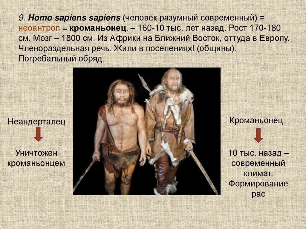 9. Homo sapiens sapiens (человек разумный современный) =неоантроп = кроманьонец. – 160-10 тыс. лет назад. Рост 170-180