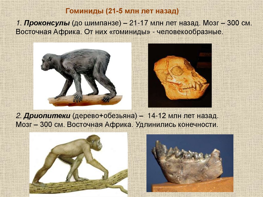 Гоминиды (21-5 млн лет назад)1. Проконсулы (до шимпанзе) – 21-17 млн лет назад. Мозг – 300 см.