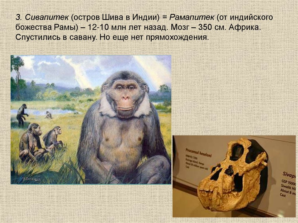 3. Сивапитек (остров Шива в Индии) = Рамапитек (от индийскогобожества Рамы) – 12-10 млн лет назад. Мозг – 350 см. Африка.