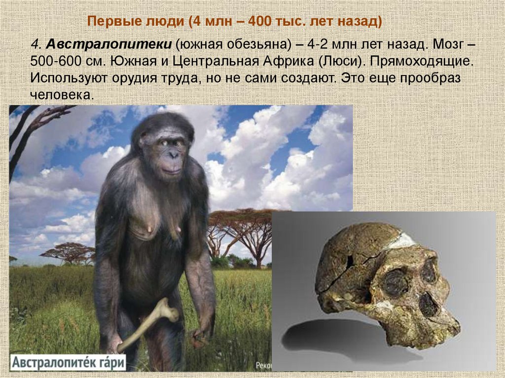 Первые люди (4 млн – 400 тыс. лет назад)4. Австралопитеки (южная обезьяна) – 4-2 млн лет назад. Мозг –